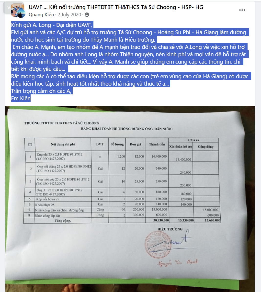 EM gửi anh và các A/C dự trù hỗ trợ trường Tả Sử Choong – Hoàng Su Phì – Hà Giang làm đường nước cho học sinh tại trường do Thầy Mạnh là Hiệu trưởng;