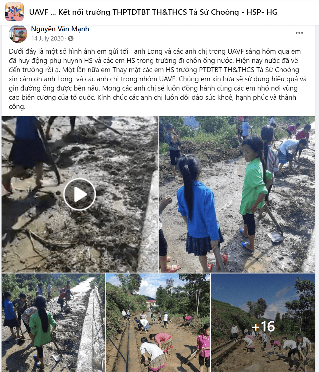 🚩Năm 2020 trong đợt Covid, UAVF chúng ta đã có thể tài trợ cho dự án hệ thống đường ống dẫn nước sạch (dài 1.2km, phi 25), giúp được cho gần 400 học sinh và giáo viên Trường, đa số học sinh người dân tộc thiểu số (Mông, Tày, Nùng).