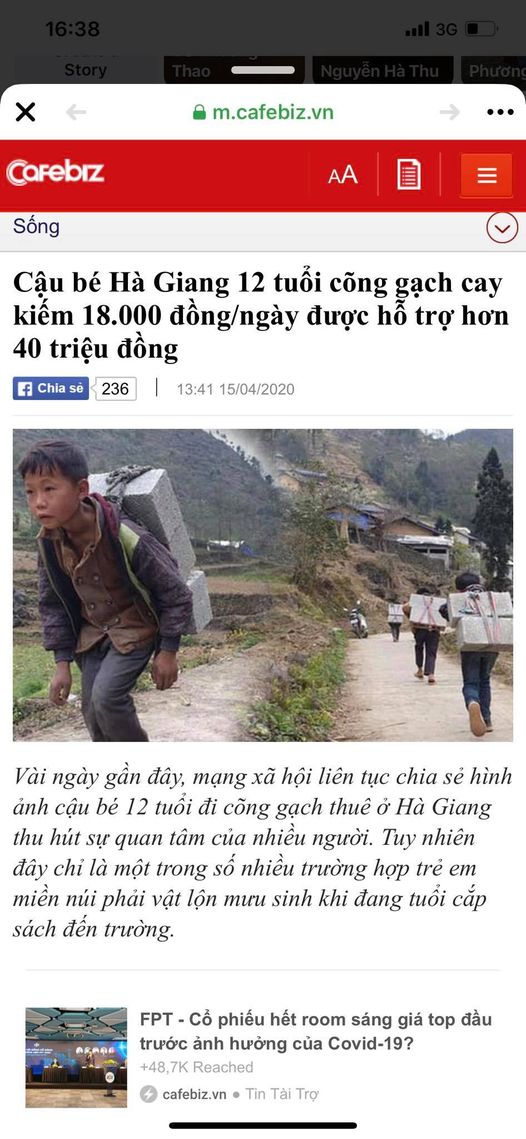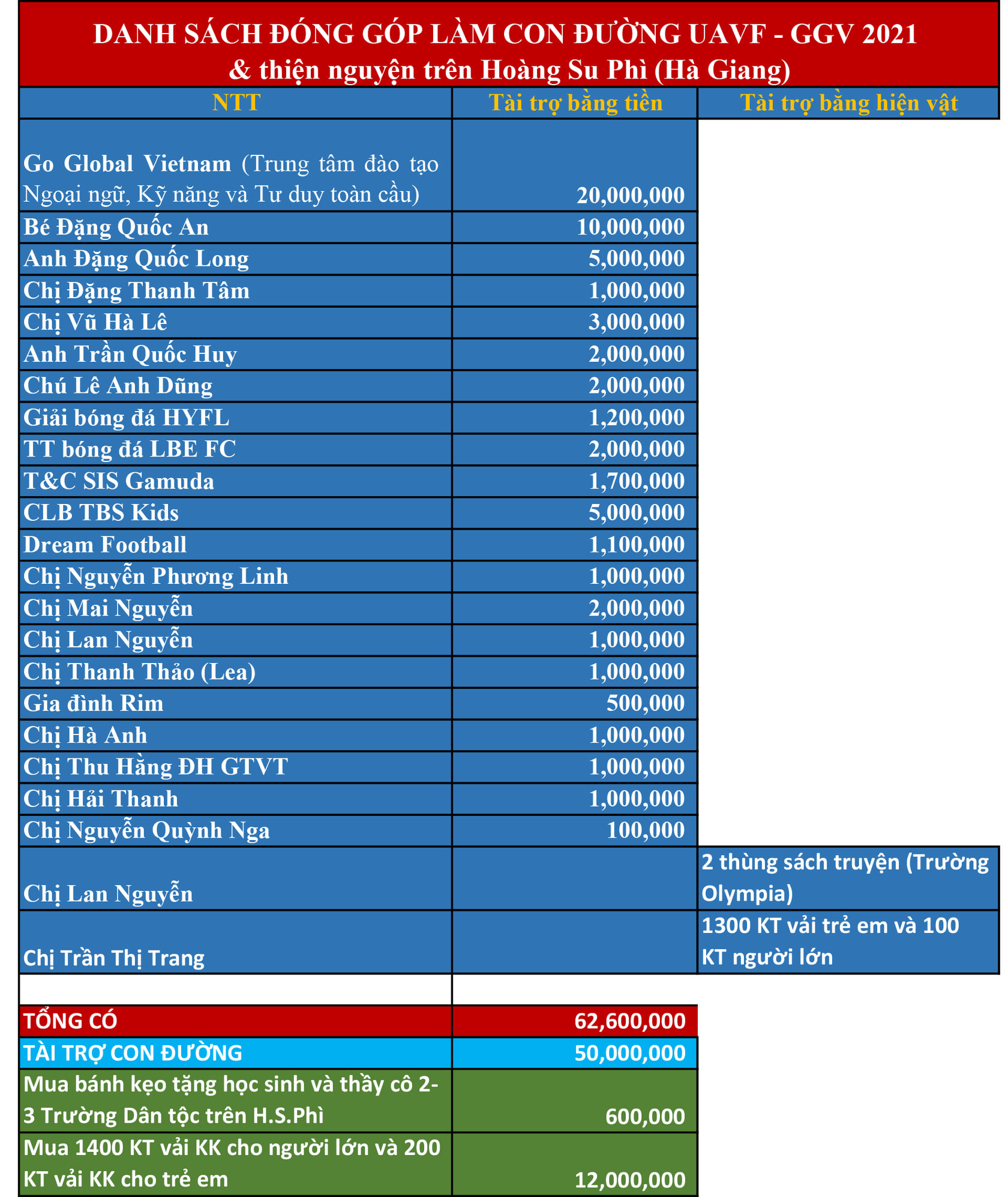 • Tài trợ toàn phần một con đường bê tông 300m*2m tại thôn Bản Chè 2, xã Tân Tiến, Hoàng Su Phì, Hà Giang.