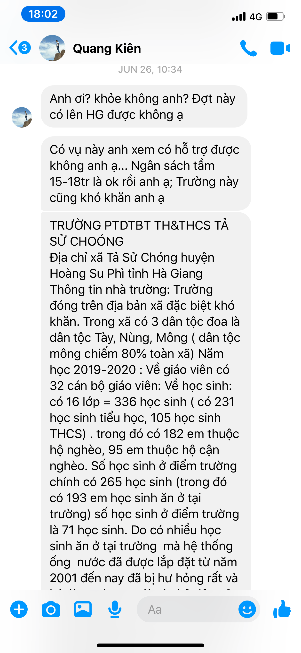 . Tài trợ toàn phần một hệ thống đường ống dẫn nước sạch (dài 1.2km * 2.3cm) tới trường Phổ thông dân tộc nội trú – THCS Tả Sử Chóong, Hoàng Su Phì, Hà Giang; Gần 400 học sinh và giáo viên của trường từ nay đỡ phải lo không có nước, phải vất vả bê từng chậu nước đường xa để đun sôi cho ăn/uống, để tắm, vệ sinh sạch sẽ thường xuyên.