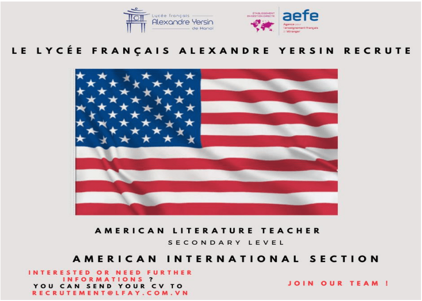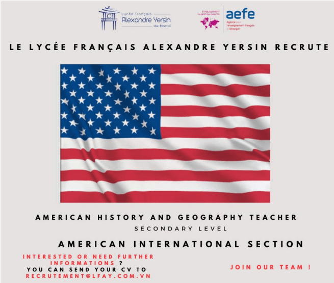 Send your CV and cover letter to recrutement@lfay.com.vn (office@uavf.org) if you are interested, or would like more information (perks, salary, the US section curriculum, AEFE network…) : email subject « candidature PDL 2023_AGLSI » for futher supports.