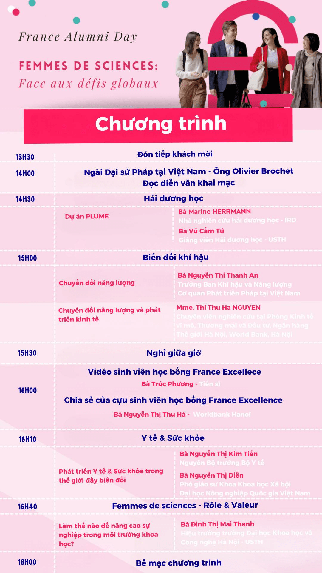 Diễn giả là các cựu sinh viên Việt Nam tại Pháp cùng các nữ nghiên cứu Việt Nam – Pháp sẽ phát biển về những nghiên cứu và đóng góp của họ trước những thách thức trên toàn cầu hiện nay : Biến đổi khí hậu – Chuyển đổi năng lượng – Môi trường biển – Sức khỏe. Các bài thuyết trình sẽ được dịch đồng thời sang tiếng Pháp/tiếng Việt.