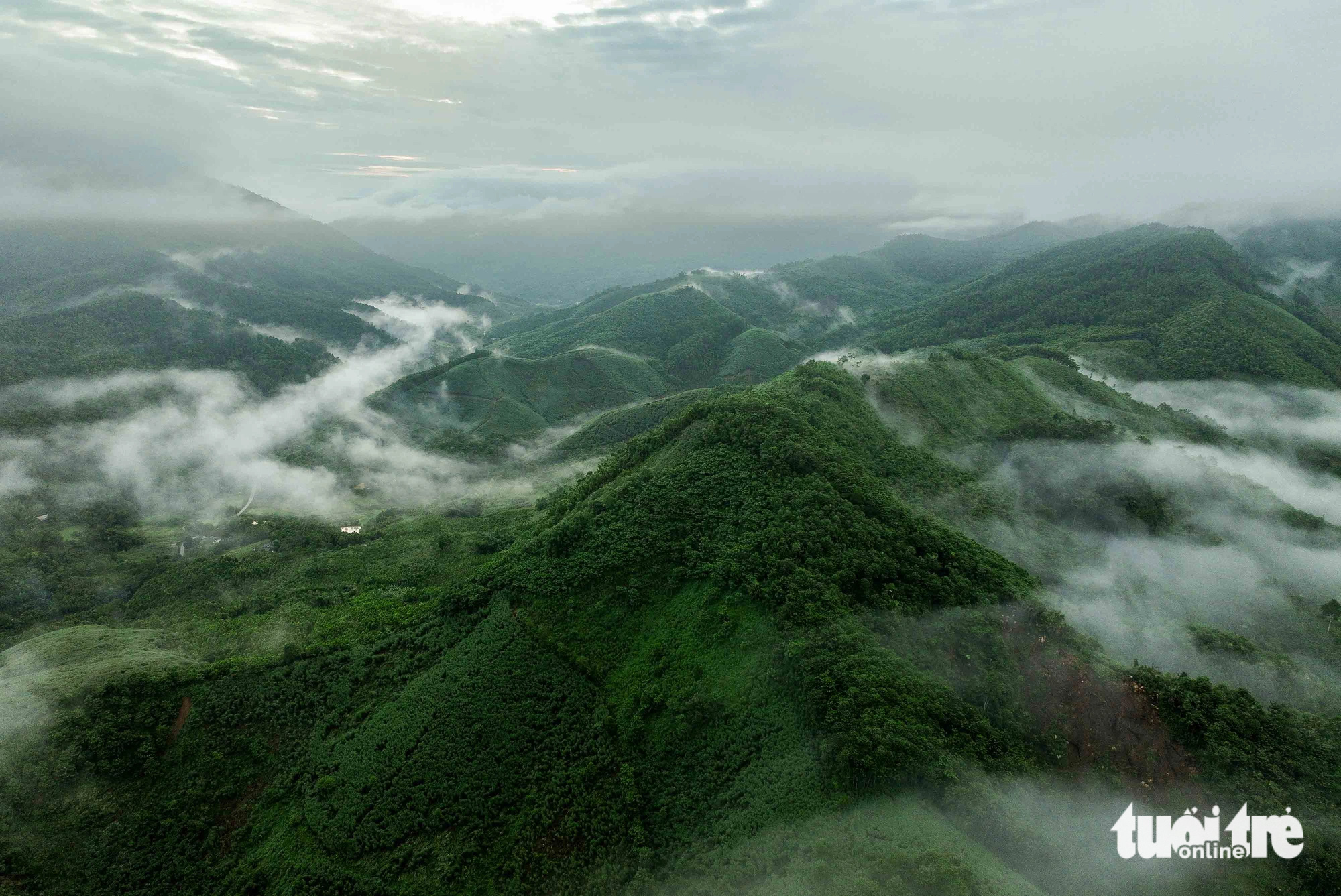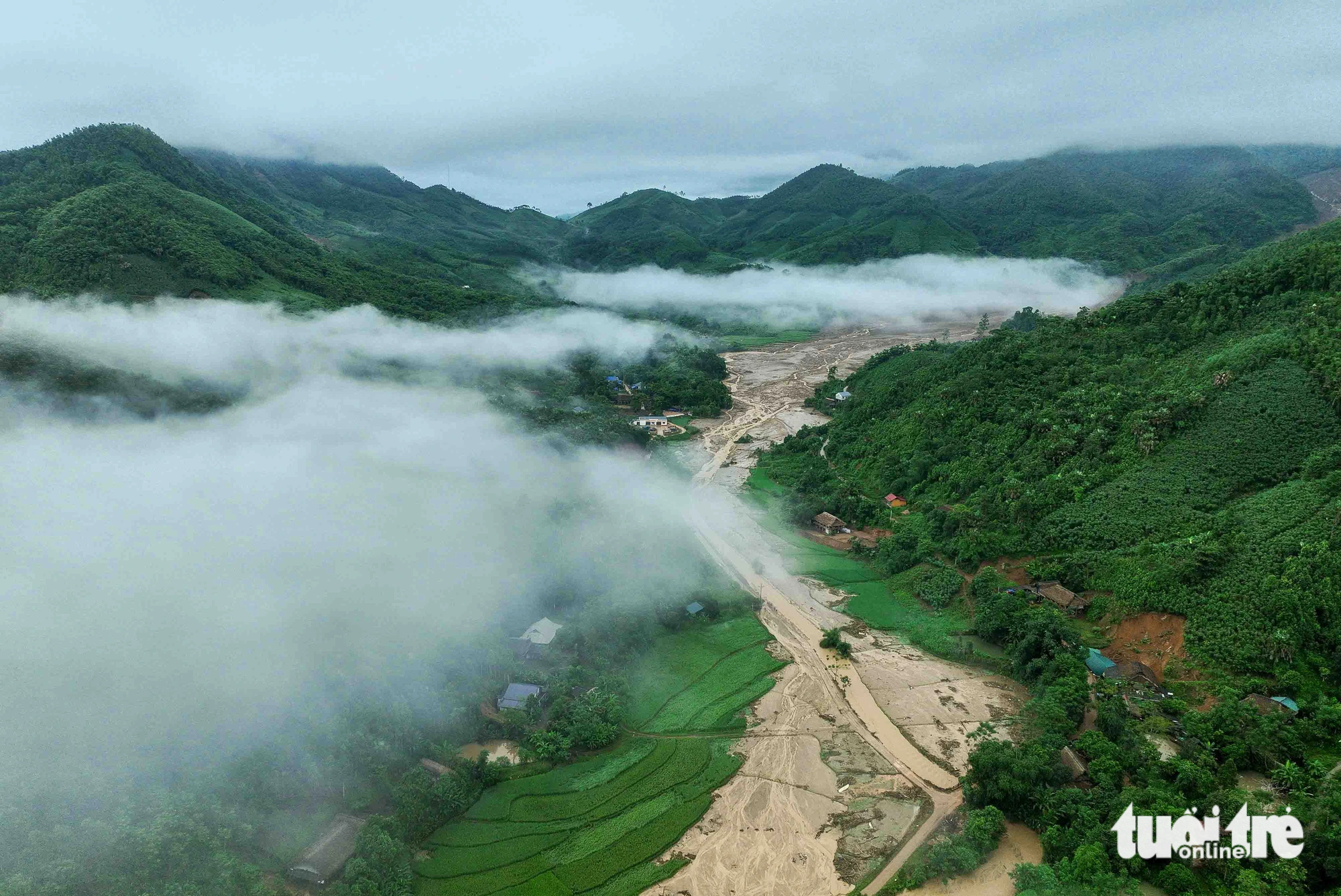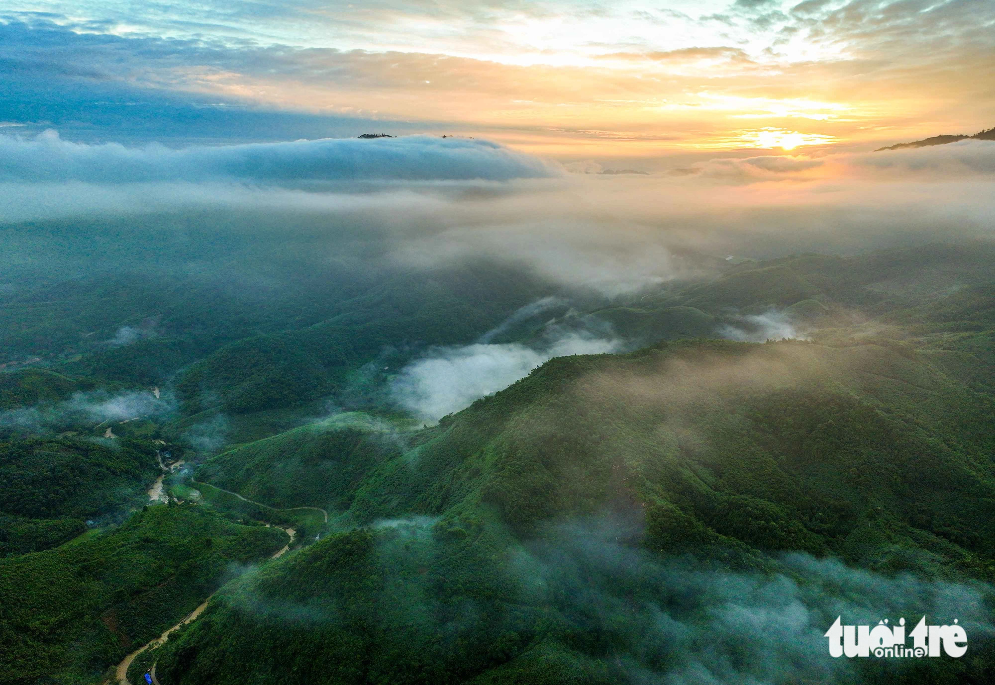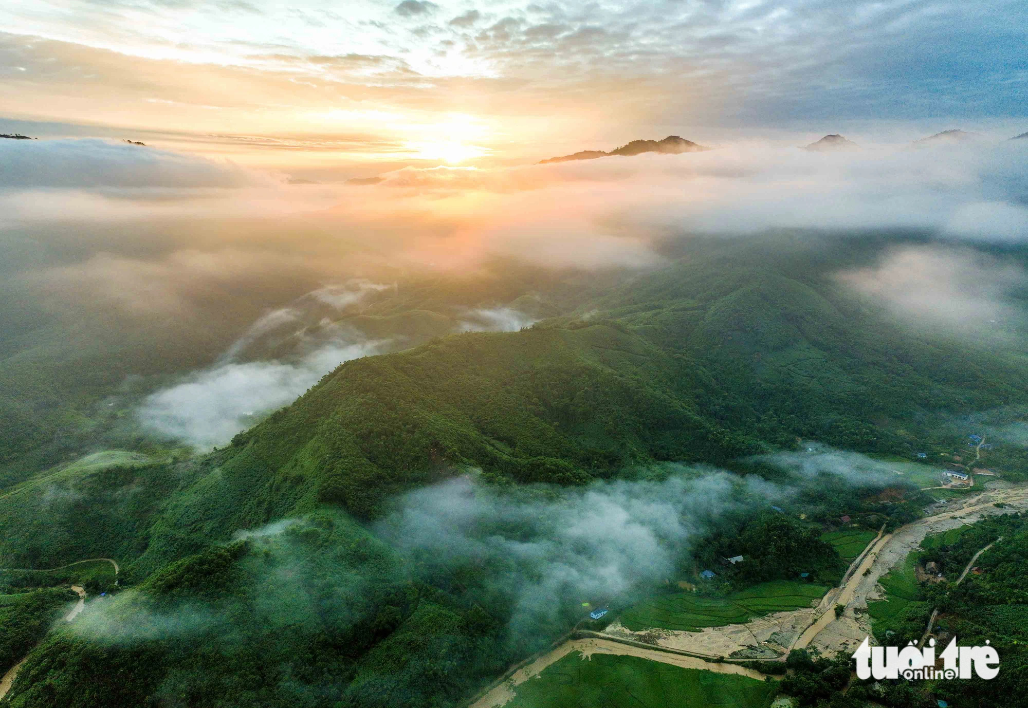 Bình minh tại Làng Nủ với những tia nắng vàng và mây luồn sà trên mặt núi, phía dưới là suối Vằng Cuồng sau cơn lũ quét – Ảnh: NGUYỄN KHÁNH