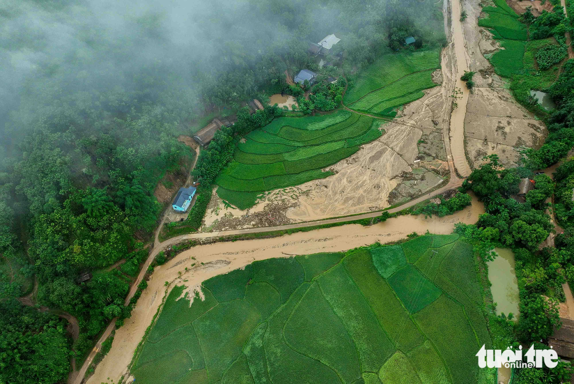 Nhìn từ trên cao, không ai nghĩ rằng nơi đây cách đây hai ngày đã xảy ra vụ lũ quét kinh hoàng khiến 36 người thiệt mạng và 59 người dân Làng Nủ còn mất tích dưới đống đổ nát.