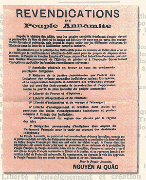 | Những người Việt Nam yêu nước tại Pháp như Phan Châu Trinh, Phan Văn Trường, Nguyễn Tất Thành đã viết “Bản yêu sách của nhân dân An Nam” gồm 8 điểm bằng tiếng Pháp và ký tên đại diện là Nguyễn Ái Quốc. Được sự giúp đỡ của một số đảng viên trong đảng Xã hội Pháp, ngày 18-6-1919 anh Nguyễn đến trao bản yêu sách này cho Văn phòng Hội nghị ở lâu đài Versailles và lần lượt gửi bản yêu sách đến Tổng thống Mỹ và các đoàn đại biểu các nước dự hội nghị. Bản yêu sách đã được đăng toàn văn trên hai tờ báo L’Humanité (Nhân đạo) và Le Populaire (Dân chúng), cơ quan ngôn luận của Trung ương đảng Xã hội Pháp, với đầu đề “Quyền của các dân tộc”. Đồng thời, Nguyễn Ái Quốc còn in bản yêu sách đó thành truyền đơn với 3 thứ tiếng Pháp, Việt, Hán để tuyên truyền rộng rãi tới mọi đối tượng, nhất là trong công nhân Pháp, binh lính người Việt, Việt kiều ở Pháp và gửi về Việt Nam qua đường bưu điện, hoặc qua thủy thủ, lính hồi hương. |